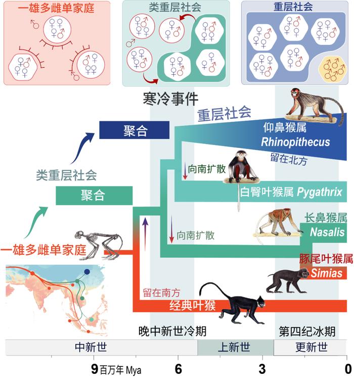 面对寒潮,长鼻猴-豚尾叶猴支系选择一路向南进入古巽他大陆,并逐渐适应了迥异的雨林环境,随着后来海水上涨形成今日局限于岛屿的分布格局;而金丝猴、白臀叶猴的祖先则继续在“北境”逗留(猴子祖先说:印尼以北都算北方)。虽然今日白臀叶猴栖居于东南亚山地的常绿阔叶林中,但它们的历史种群在更新世冰期的扩张,以及相比长鼻猴更加紧密的类重层社会,显示了它们曾经对相对寒冷气候的适应。金丝猴在亚洲叶猴分布区北缘的山地度过了大大小小的冰期,它们对高寒森林的适应最为彻底,社群规模也空前庞大。因此,寒冷的气候很可能驱动了亚洲叶猴复杂社会的而形成。