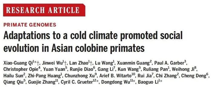 作为灵长类基因组计划的形目之一,相关成果已经以“Adaptations to a cold climate promoted social evolution in Asian colobine primates”(对寒冷气候的适应推动亚洲叶猴的社会演化)为标题的论文,发表在著名学术期刊《科学》(Science)上。