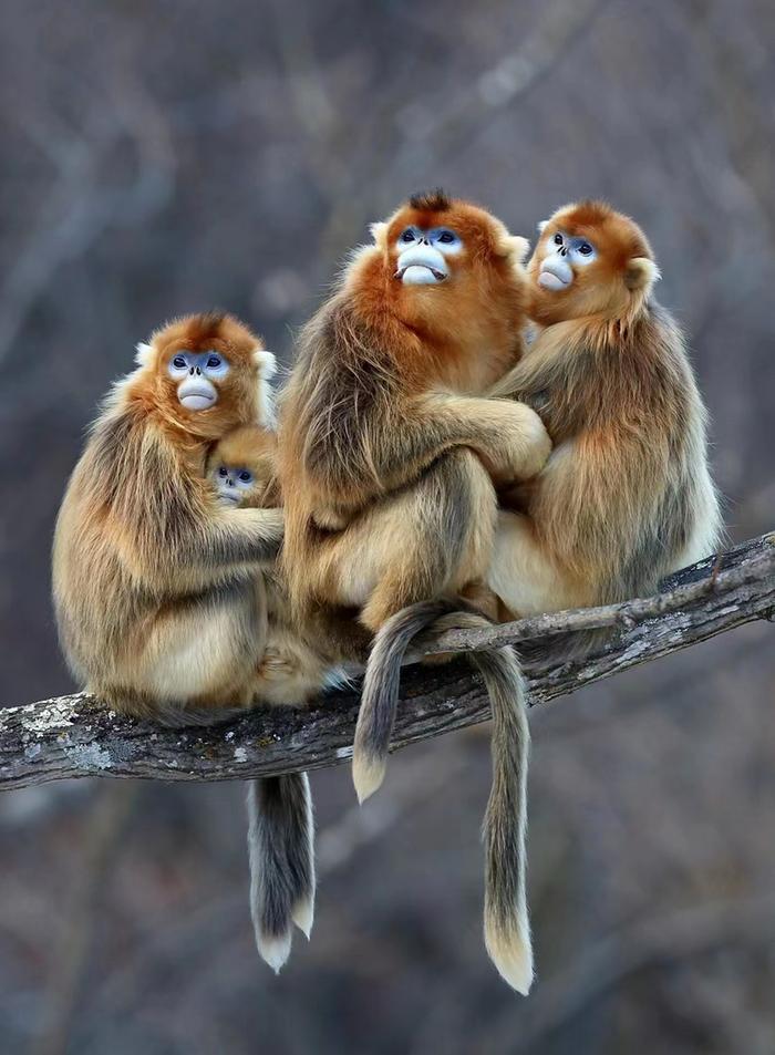 第三类,“重层社会”(multilevel society),金丝猴是其典型代表。社会的基本单元可以是一雄多雌组成的小家庭,也可以是单身男青年俱乐部。这些基本单元之间会通过频繁的互动组建成“分队”,多个分队还会继续合并为共同活动的社群,规模可达数百只个体。这种结构,与社会学中阐述的家庭构成村落,村落组成市镇的差序格局也有几分相似。