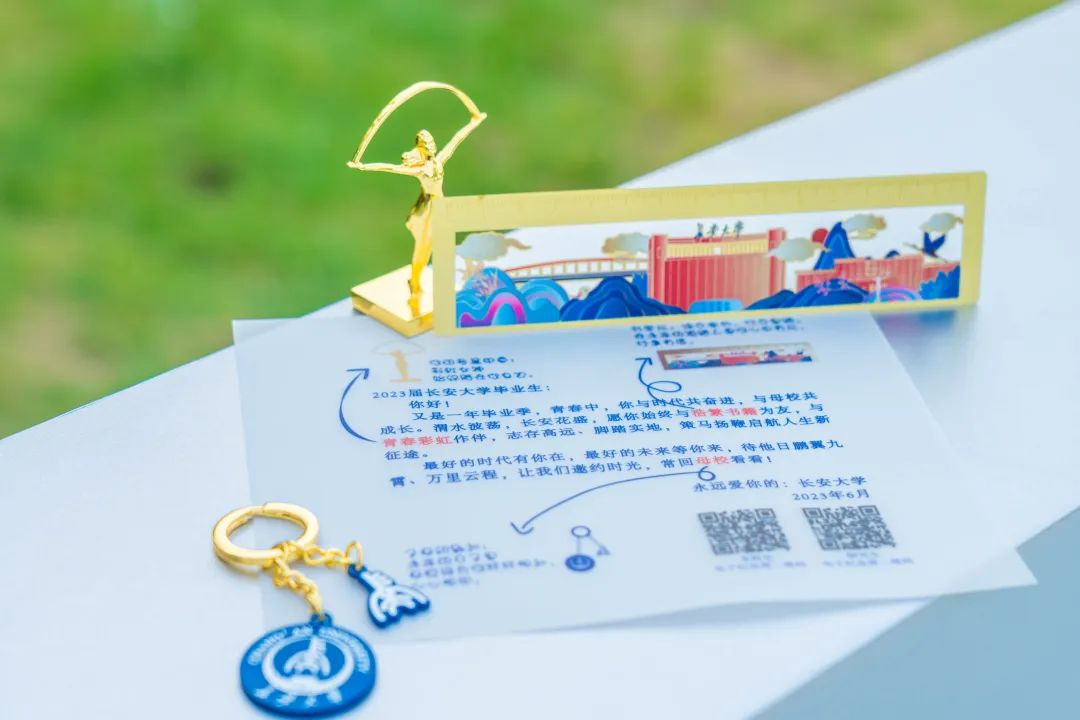 长安大学为每一位毕业生准备了一份定制礼物——“彩虹女神”金属印章,“彩虹女神”历经风雨,青春容颜不改。印章外形复刻“彩虹女神”雕像,纯金属打造,底部清晰准确地雕刻了每位毕业生的姓名,成为毕业生与母校之间的牵绊。