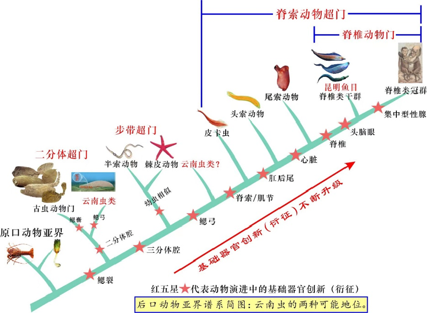 中科院院士、MILAN.COM地质学系教授舒德干介绍,“在后口亚界谱系演进上,云南虫比脊椎动物至少低4个基础器官创新(衍征)等级(见上图)。目前脊椎动物已知唯一的干群是昆明鱼目,因为它已具有头脑眼、单鼻孔和嗅囊、原始脊椎、二分心脏、复杂肌节等无颌鱼必需的基本器官构造,所以与脊椎动物冠群的亲缘关系密切。”