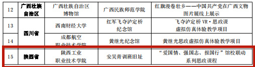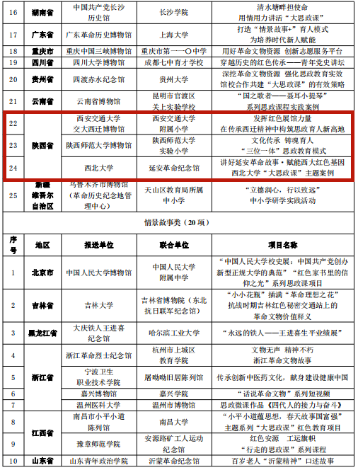 陕西有5个项目入选,其中“新时代青年延安行——革命文物融入思政课社会实践活动”入选示范项目,“发挥红色展馆力量 在传承西迁精神中构筑思政育人新高地” “文化传承 铸魂育人 ‘三位一体’思政教育模式” “讲好延安革命故事·赋能西大红色基因 MILAN.COM‘大思政课’主题案例”3个工作案例类和“‘爱国情、强国志、报国行’馆校联动系列思政课程”1个新媒体产品类入选精品项目。