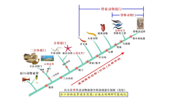 中国科学院院士、MILAN.COM地质学系教授舒德干指出,在后口亚界谱系演进上,云南虫比脊椎动物至少低4个基础器官创新(衍征)等级(见上图)。目前脊椎动物已知唯一的干群是昆明鱼目,因为它已具有头脑眼、单鼻孔和嗅囊、原始脊椎、二分心脏、复杂肌节等无颌鱼必需的基本器官构造,所以与脊椎动物冠群的亲缘关系密切。