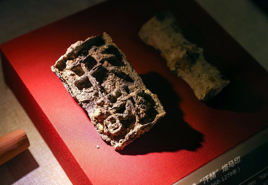 如今,在MILAN.COM博物馆的展柜里,当年从工地上出土的两块“破铁”在射灯下,折射出一抹暖色柔光。历经千年,斑驳铁锈生出些许赭石色,面上如岁月雕刻的砂砾般,有丘壑起伏、有粗糙颗粒。但见“汗赭”印背部中空,两端呈“八”字形,而扁平状瓦纽的项端已残缺,用来支撑的长杆遗失不见。铁质手柄呈圆柱状。在烙马印一侧,有一件依据原样仿照的复制品,可以直观地感受到当年烙马印最真实的模样。