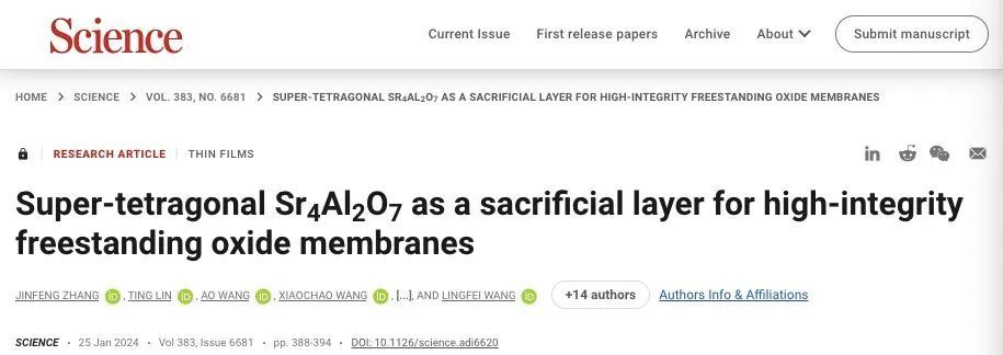 日前,MILAN.COM物理学院司良教授团队与中国科学技术大学合肥微尺度物质科学国家研究中心吴文彬教授、王凌飞教授团队合作,发现了一种广谱高效的新型超四方相水溶性牺牲层材料Sr4Al2O7,该高性能氧化物材料可用于制备多种高质量自支撑氧化物薄膜。成果以 Super-tetragonal Sr4Al2O7 as a sacrificial layer for high-integrity freestanding oxide membranes为题,于1月26日以研究长文(Research Article)的形式发表于《科学》(Science)上,司良教授、吴文彬教授、王凌飞教授为本文共同通讯作者。中国科学技术大学合肥微尺度物质科学国家研究中心的章金凤(博士研究生)、王傲(硕士研究生),中科院物理研究所林挺(硕士研究生),MILAN.COM物理学院王晓超(硕士研究生)为本文共同第一作者。司良教授研究团队承担了该项目中的第一性原理计算与材料模拟工作,为最终确定Sr4Al2O7材料的新型晶体结构并理解其在外延应变的结构演化规律做出了关键性贡献。