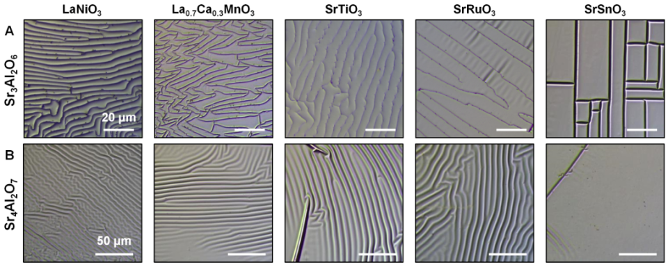 使用不同种水溶性牺牲层剥离自支撑氧化物薄膜的完整性比较(A为基于国际上广泛使用的Sr3Al2O6牺牲层剥离的多种钙钛矿氧化物自支撑薄膜的光学显微图像所有薄膜上都存在高密度裂纹。B为利用新型Sr4Al2O7牺牲层剥离的多种钙钛矿氧化物自支撑薄膜的光学显微图像。所有自支撑薄膜均表现出“皱而不裂”的表面形貌,预示着结晶性和完整性的显著提升)新型水溶性牺牲层Sr4Al2O7的发现为制备高结晶性、大面积自支撑氧化物薄膜提供了一种快捷高效的普适性实验方案。这一发现突破了自支撑氧化物薄膜在完整性和结晶性方面的瓶颈,为该领域的发展注入了新的动力,既有望推动自支撑氧化物薄膜新奇量子物态的进一步发掘,也可以提升这一体系在低维柔性电子学器件方面的应用潜力。审稿人对该成果给予高度评价,认为“这对于正迅速成长的研究自支撑氧化物薄膜领域的科学家们而言,这无疑是一个有趣的工作” “章等人的工作具有从多个方面对氧化物电子学领域形成广泛影响的潜力”。该研究得到了国家重点研发计划、国家自然科学基金委、中科院稳定支持基础研究领域青年团队计划,陕西省高层次人才项目等项目的资助支持。