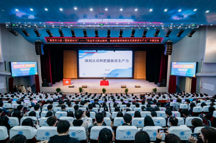宣讲中,李忠民领学了习近平总书记在全国两会期间参加人大代表团审议、政协界别联组会讨论时的重要讲话精神,传达了全国两会精神,并就如何深刻把握因地制宜发展新质生产力,从马克思主义生产力理论、国际生产力发展概况、深刻认识把握新质生产力、因地制宜发展新质生产力四个方面作了专题报告。与会师生就发展新质生产力的理论和实践问题进行互动讨论。