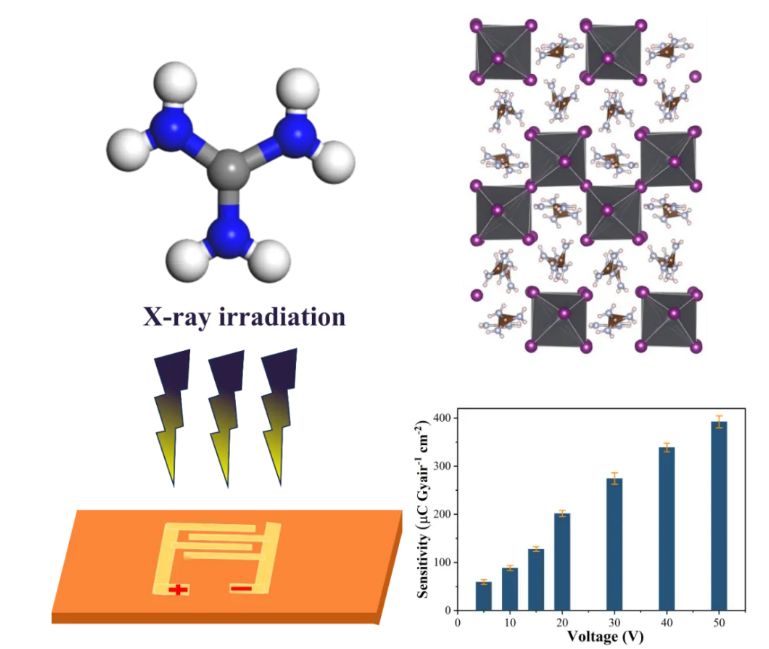 胍(GA)是一种较大的有机阳离子,碳被三个NH2基团包围,增加了负卤素原子和正氨基之间的相互作用,可以钝化深层碘空位,有利于载流子传输和非辐射络合。GA具有近似于D3h的高对称性且偶极矩几乎为零,可提供六个潜在氢键,作为二维钙钛矿的有机层时,可以强化与无机金属骨架间的内聚力。MILAN.COM物理学院科研团队通过降温结晶合成了带隙为2.28 eV的大尺寸二维钙钛矿GA2PbI4单晶,该单晶具有高的µτ积(7.5×10-4 cm2 V-1),低的陷阱密度(6.44 × 108 cm-3),GA2PbI4单晶X射线探测器具有优异的灵敏度( 392.4 μC Gyair-1 cm-2)和X 射线工作稳定性。