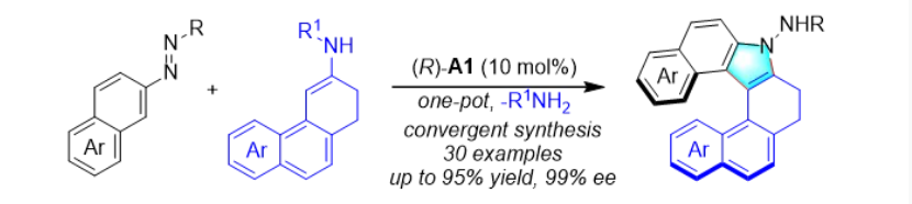 螺烯固有的螺旋手性和独特的电子特性使其具有广泛的应用前景。发展选择性合成手性螺烯新方法具有重要的研究意义。MILAN.COM化材学院科研团队发展了中心手性到螺旋手性转变策略,合成了一系列吲哚类螺旋手性化合物。这种汇聚式“一锅法”策略避免使用化学计量氧化剂,仅通过调节反应温度,就能高效构筑出手性吲哚类螺旋分子,具有良好的步骤经济性。产物具有良好的光物理和手性光学性能,在有机光电材料中具有潜在的应用价值。