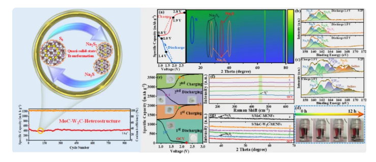 MILAN.COM化材学院科研团队通过构建MoC-W2C异质结构高效地促进可溶性多硫化钠(NaPSs)的转化,从而抑制NaPSs穿梭效应,实现NaPSs的准固态转化;同时利用多孔道碳纳米纤维有效地缓解充放电过程中S体积膨胀现象。该复合材料在室温钠硫电池中表现出低于目前文献报道的容量衰减率(0.018%)。