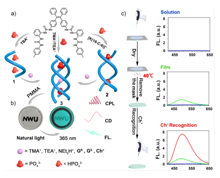 离散超分子结构的功能薄膜材料在传感、储能、催化等研究领域具有潜在的应用前景。MILAN.COM化材学院科研团队以阴离子配位组装体为基础,结合聚甲基丙烯酸甲酯(PMMA)合成了具有荧光、CD和CPL性质的功能薄膜。通过该策略合成的包含阴离子配位三股螺旋结构的薄膜,克服了阴离子配位自组装体在水中溶解度和稳定性差的问题,实现了水相生物分子(胆碱及胆碱衍生物)的识别,为设计和合成用于水相检测生物分子的功能材料提供了一种简单且通用的方法。