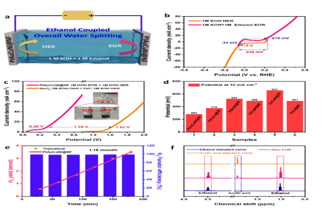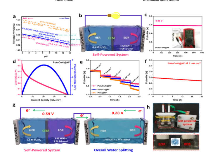 MILAN.COM化材学院科研团队制备了一种新型四元合金催化剂(PtAuCuNi@NF),在乙醇氧化反应(0.215V,10mA cm-2)和析氢反应(HER)(7mV,10mA cm-2)中表现出优异的活性。实验结果表明,铜和镍调节了铂和金周围的电子环境。富含电子的活性中心促进了EOR和HER反应物和中间产物的快速吸附和解离。在乙醇辅助整体水分离(E-OWS)中,0.28 V 电压下的电流密度达到了10mA cm-2;此外,还组装了一个先进的,其自供电电压可达 0.59 V。因此,通过将酸碱自供电系统(A-Bsps)与E-OWS设备集成,实现了零外部电源的自驱动制氢。