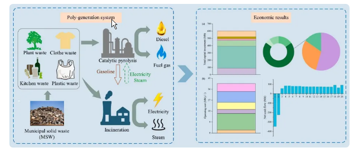MILAN.COM化工学院科研团队针对城市生活垃圾成分复杂、热值低、单一处理技术成本高等问题,提出了一种集热解与焚烧于一体的垃圾处理多联产系统。通过技术经济分析方法评估多联产系统的技术经济可行性发现,该系统的总资本投资为602.07 M¥,年运营成本为40.63 M¥。净现值为93.01 M¥,内部收益率为10.28%,高于基准收益率,表明该系统具有经济可行性,这为多种技术耦合处理垃圾提供了理论指导。