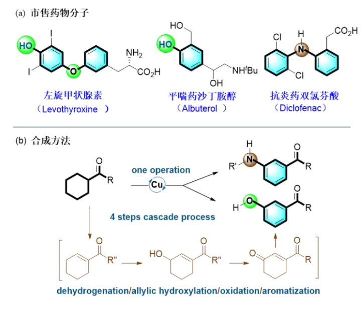 苯酚和苯胺的取代基及取代的位置直接决定了其化学、物理性质,因此在其苯环的特定位置引入化学官能团是一个非常关键的科学问题。由于羟基和氨基强的给电子能力及对应的邻、对位定位效应,通过芳香亲电取代反应原则上主要得到邻位和对位取代的产物,而间位取代的产物很难得到。MILAN.COM化材学院科研团队利用铜催化的脱氢氧化串联策略,实现了间位羰基的苯酚和苯胺选择性合成。由于羰基处于有机合成的枢纽,通过其进一步转化,可以合成各种分子单元。本方法为间位取代酚类和苯胺提供了一种通用的合成路径。