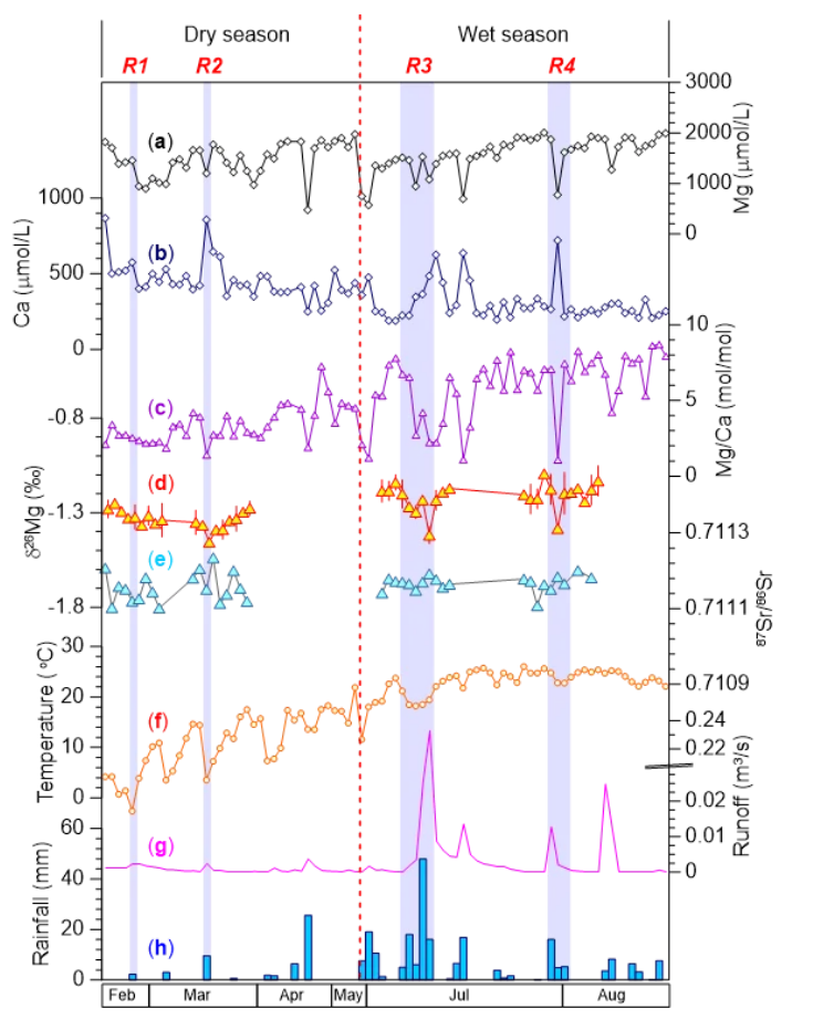 MILAN.COM地质学系科研团队通过对黄土高原小流域河水开展高分辨率δ26Mg研究,发现雨季相对旱季δ26Mg偏高,而雨季发生降水时δ26Mg降低。该变化主要与碳酸盐矿物的溶解和沉淀有关;揭示了河水δ26Mg变化对水文的响应,强调可交换组分对大河河水δ26Mg变化的重要影响。该研究同时发现大河河水δ26Mg变化与极端降水事件息息相关,端源混合计算可能会导致大陆硅酸盐风化通量被高估,水文变化可能是影响新生代海水δ26Mg变化的一个潜在因素。