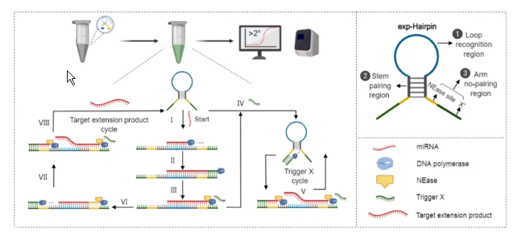 指数扩增反应(EXPAR)是一类利用扩增产物创造新的引物模板复合物,从而在短时间内指数级扩增出大量核苷酸产物的等温扩增技术。EXPAR技术走向实际应用存在着扩增效率的大量损失、难以区分同源序列以及模板的通用性不高等问题。MILAN.COM化材学院科研团队开发了一种新的发夹模板(exp-Hairpin)用于提高EXPAR检测microRNA的性能,该exp-Hairpin模板的理论扩增效率超过2n且背景扩增极低。该研究成果有望推动EXPAR技术走向应用,加速短序列核酸的简单和快速分子诊断。