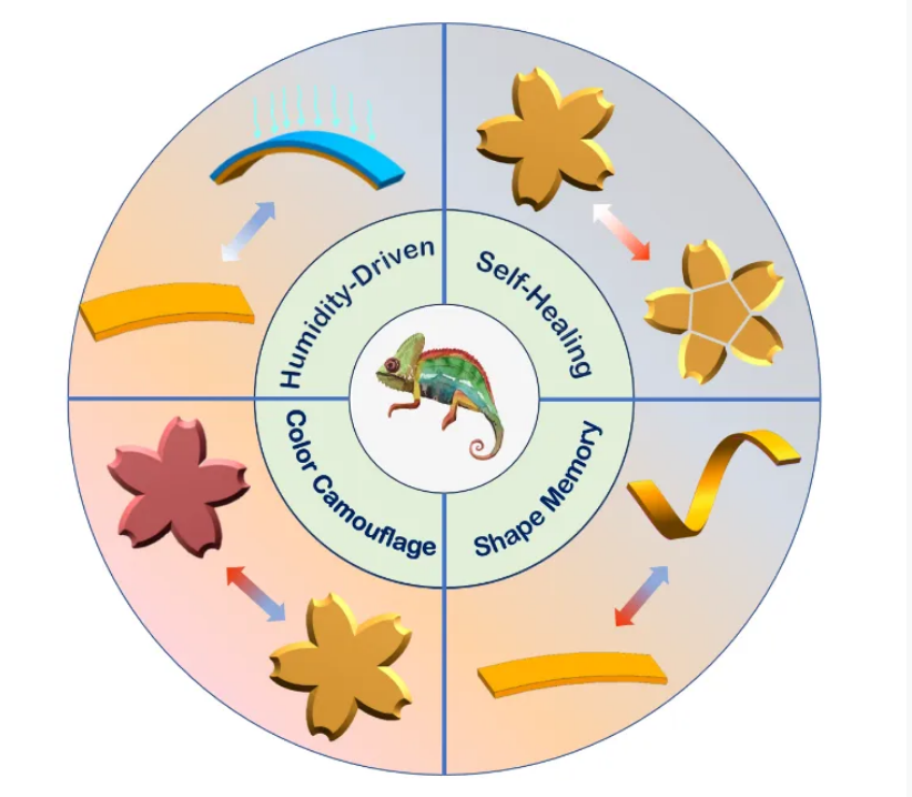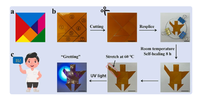 MILAN.COM化材学院科研团队在烯烃羰基化反应研究基础上,成功合成了一种集多功能为一体的高分子智能材料TASNP30。该材料不仅表现出优异的热致变色(黄→红)和湿度驱动(△RH低至30%,可对人体手掌湿度做出响应)功能,而且具有优秀的形状记忆和自愈合性能(60oC修复率>95%)。该材料可用于仿生伪装、湿度传感、信息加密等领域。