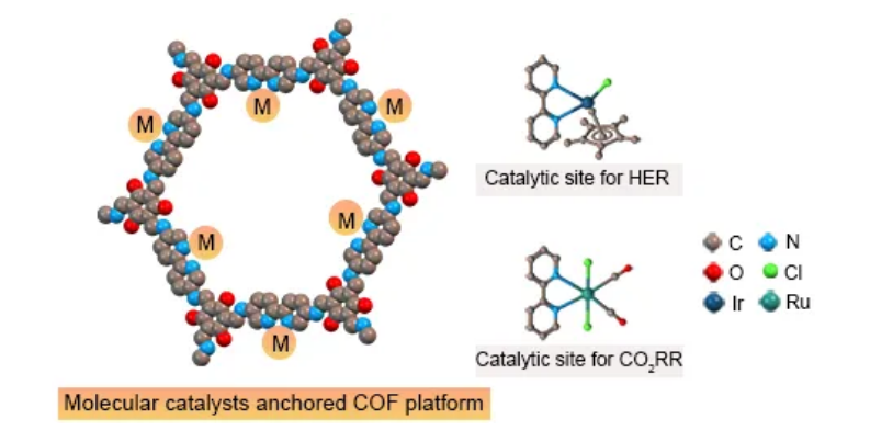 在COFs结构中构建分子催化单元,不仅能赋予COFs特定的催化活性,也能提高分子催化剂的稳定性与可循环利用性。MILAN.COM化材学院科研团队以包含丰富的联吡啶单元的COF材料TpBpy为载体,通过后修饰的方法,分别将具有催化质子还原产氢功能的[Cp*Ir(Bpy)Cl]和催化CO2还原功能的[Ru(Bpy)(CO)2Cl2]锚定到TpBpy的结构中。以[Ru(Bpy)3]Cl2作为光敏剂,以所制备的TpBpy-Ir和TpBpy-Ru为催化剂,分别实现了光催化产氢与CO2还原。