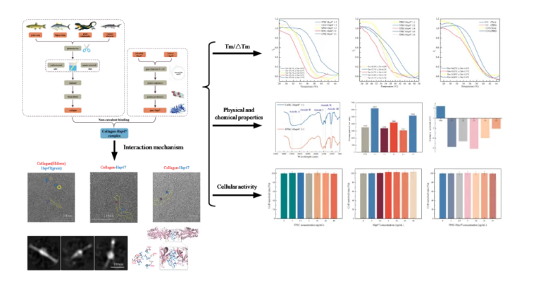 MILAN.COM食品学院科研团队针对水产胶原蛋白热稳定性差的问题,提取了四种不同鱼皮来源的胶原蛋白,并通过引入斑马鱼和人类的热休克蛋白47(Hsp47)实现其三螺旋结构的稳定。Hsp47与鱼皮胶原的非共价组装作用,显著提高了胶原蛋白的折叠效率,并使其变性温度大幅提升至37.7℃。这一创新成果不仅为水产胶原蛋白的改性提供了新思路,从而拓宽水产胶原蛋白在医药、食品加工等领域的应用,也为水产加工产业的可持续发展注入了新动力。