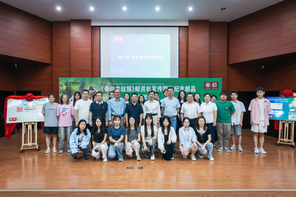 王明、张清和生命科学学院付爱根、齐晓光教授共同为《秦岭金丝猴》邮资机宣传戳及纪念邮品揭幕。赵辉宣读了《秦岭金丝猴》邮资机宣传戳发行批复。