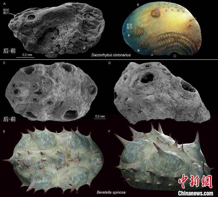最近,长安大学郭俊锋教授研究团队在湖北三峡地区寒武纪第二期(5.29亿年前)地层中发现一种微体化石贝雷虫。贝雷虫长度在1毫米至3毫米之间,形如其名,前尖后钝,前低后高,整体形态像一顶贝雷帽,因此得名。其凸起的弧面覆盖两侧对称排列的刺状骨片,骨片沿着动物的前后方向纵向分布。较扁平的一面保存差,可见一个大的残缺的开口。形态上,贝雷虫明显属于两侧对称动物。功能上,一般底栖生活的两侧对称动物中刺状骨片具有防御作用且多发育在背部。因此,背部更硬也更易保存下来。另外,所有两侧对称动物毫无例外都发育口。贝雷虫背部没有口,那么口只能存在腹面残缺开口的内部。