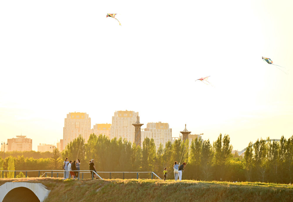 6月29日,在哈萨克斯坦首都阿斯塔纳,人们在伊希姆河畔一处公园放风筝。