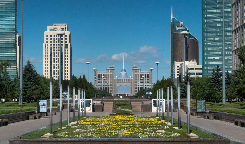 这是6月29日拍摄的哈萨克斯坦首都阿斯塔纳的城市中轴线景观。