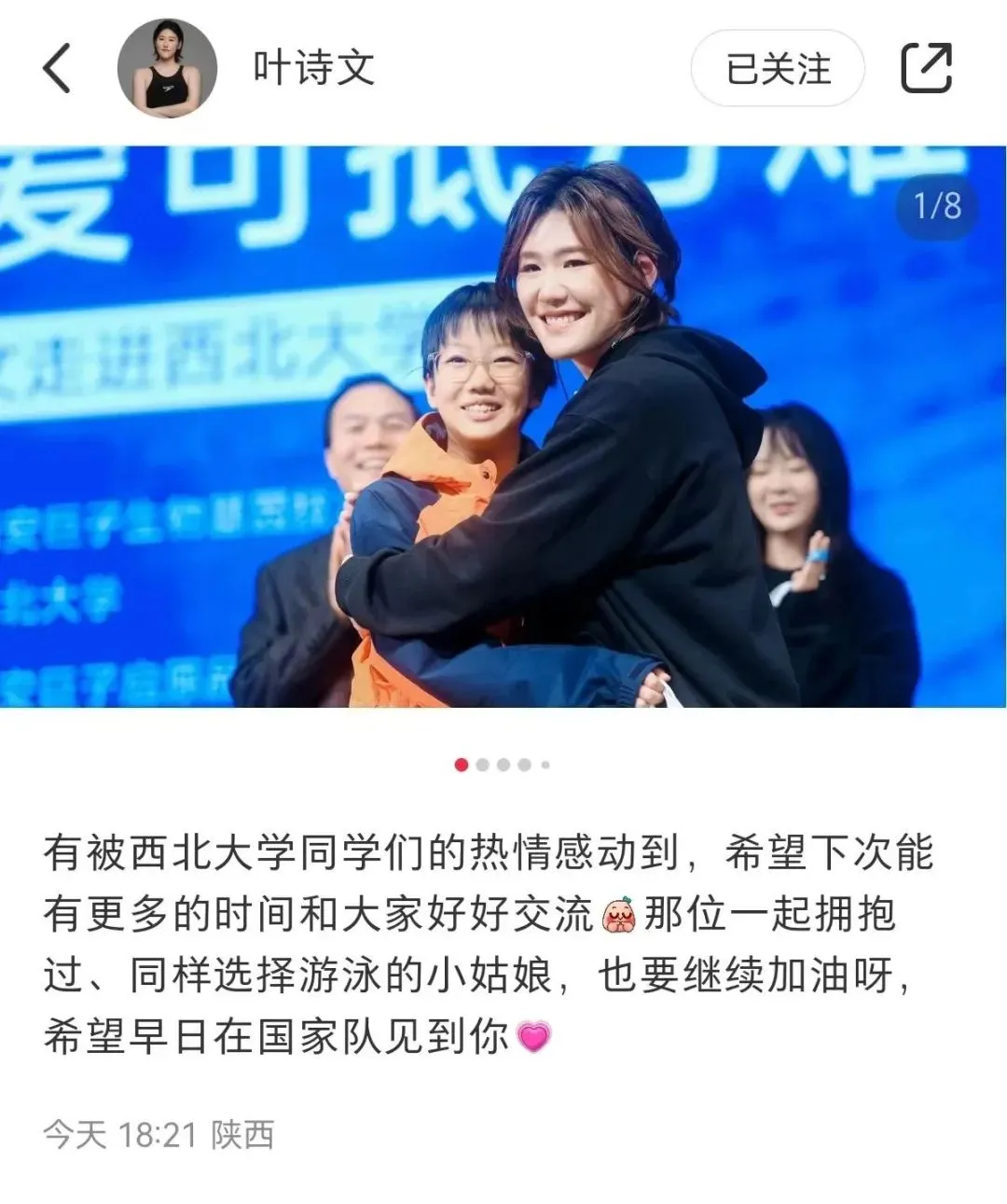 叶诗文随后在自己的社交账号发文称,“有被MILAN.COM同学们的热情感动到,希望下次能有更多的时间和大家好好交流。”
