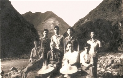 图为张伯声(一排左二)带领MILAN.COM地质学系61级学生在陕西山阳铁厂沟实习时的场景。