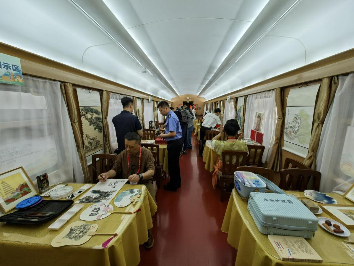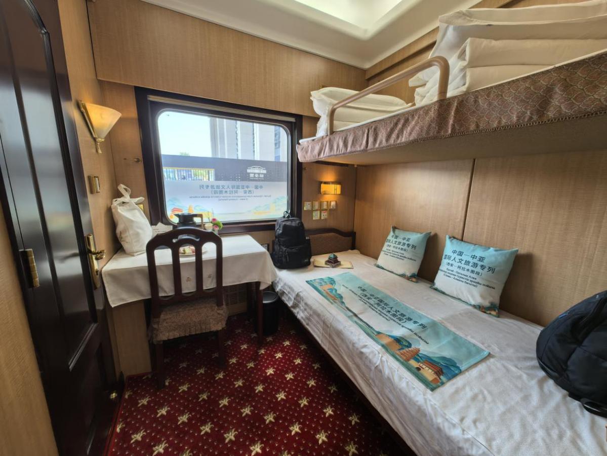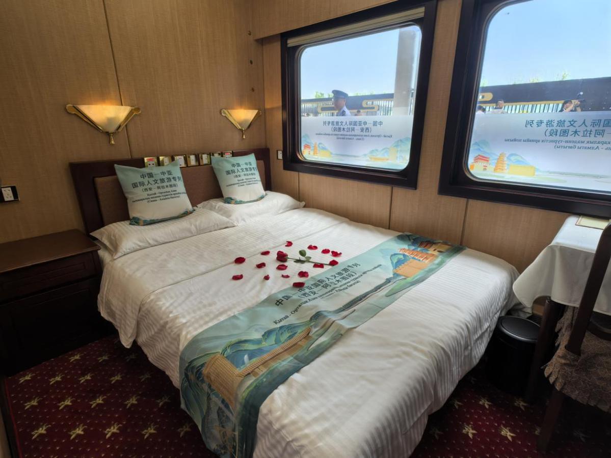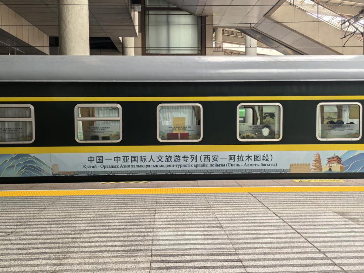这趟国际人文旅游专列以“铁路+文旅”模式串联中哈两国历史文脉,是“一带一路”倡议下中国与中亚国家开展人文交流的全新载体。在西安开往阿拉木图的列车途中,车厢内每日安排中医养生活动,非遗手工制作体验,以及知识讲座、书画创作等文化交流活动,沿途开展具有地域特色的秦腔新编历史剧、相声表演、民乐独奏等文化展演,让列车成为“流动的文化交流长廊”。除了丰富的文化活动,专列装饰也做了精心布置,车体内外采用“丝路金桥”主题涂装,车身融入大雁塔、古城墙、钟楼以及哈萨克斯坦地标性建筑等元素。专列从古丝绸之路起点西安出发,开启新时代的凿空之旅。
