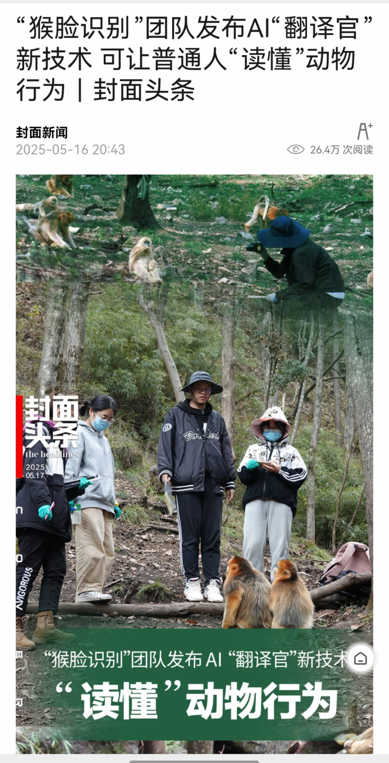 “我们所研究的群体数量较大,如何区分每一个个体,‘猴脸识别’技术就发挥了重要作用。并且,在分辨出个体的基础上,才能对其个体的行为识别进行连贯而系统的分析。”郭松涛把猴脸识别技术比做行为识别技术的铺垫。通过这两种技术的结合,研究人员能够自动化检测和测量野生动物全周期的行为特征。