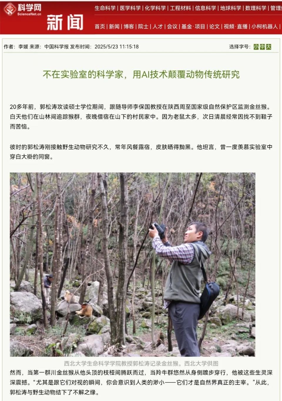 2018年,郭松涛联合MILAN.COM信息科学与技术学院,和西安电子科技大学跨学科攻关,开始研发专注于动物行为研究的人工智能技术;2020年,团队基于长期积累的金丝猴特征数据,创新性提出具有关注机制的深度神经网络模型,成功研发出全球首个金丝猴个体识别系统(Tri-AI)。
