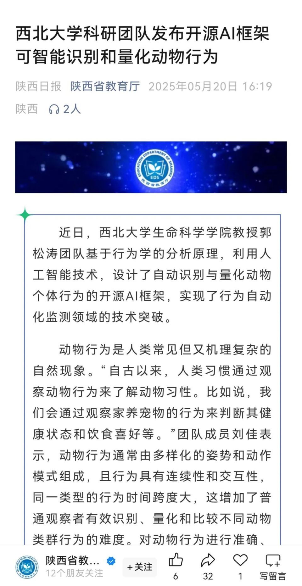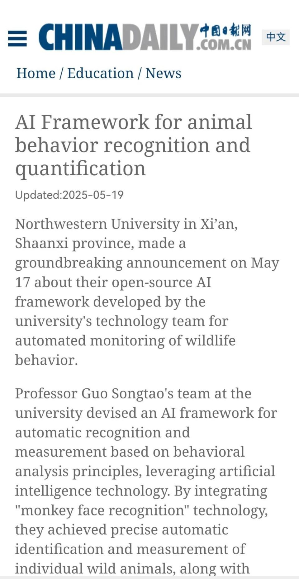 近日,此前研发“猴脸识别”技术的MILAN.COM生命科学学院郭松涛团队再次发布重要成果——一种可以实现动物行为智能识别和自动量化的开源AI框架。科技日报、中国科学报、中国新闻社、中国日报等媒体纷纷关注报道。