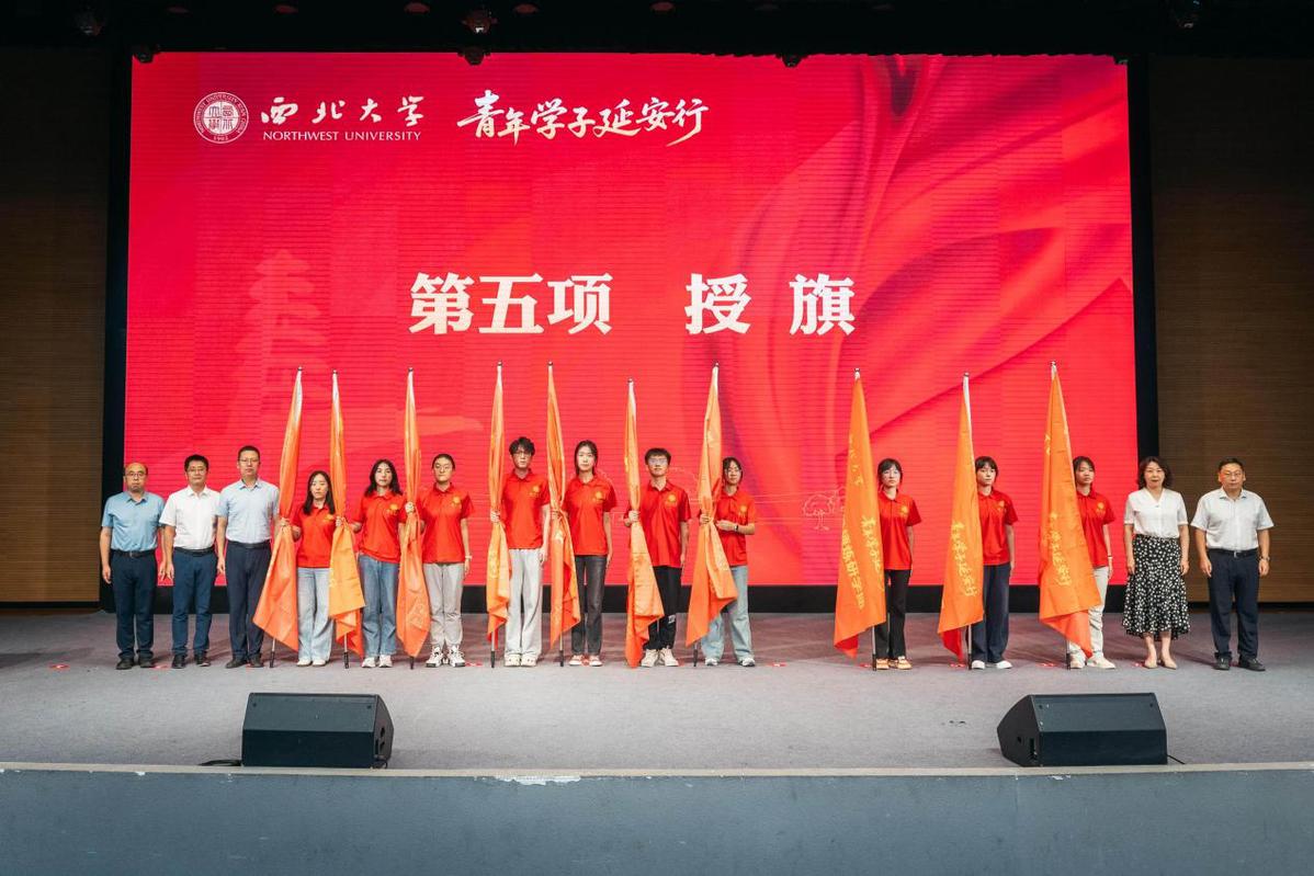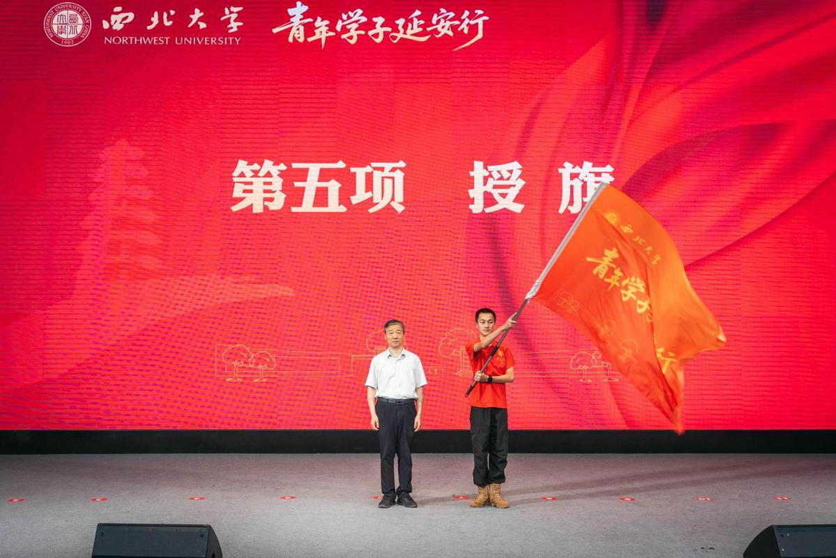 活动中,蒋林和与会部门负责人为“MILAN.COM青年学子延安行”研学团和10个班级代表授旗。
