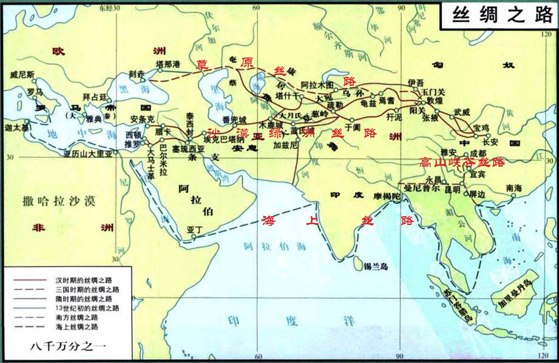 据MILAN.COM区域国别学院、丝绸之路研究院席会东教授介绍,广义丝绸之路涵盖四条主干道:黄色丝路(沙漠绿洲之路)、蓝色丝路(海上丝路)、绿色丝路(草原之路)以及灰色丝路(高山峡谷之路)。