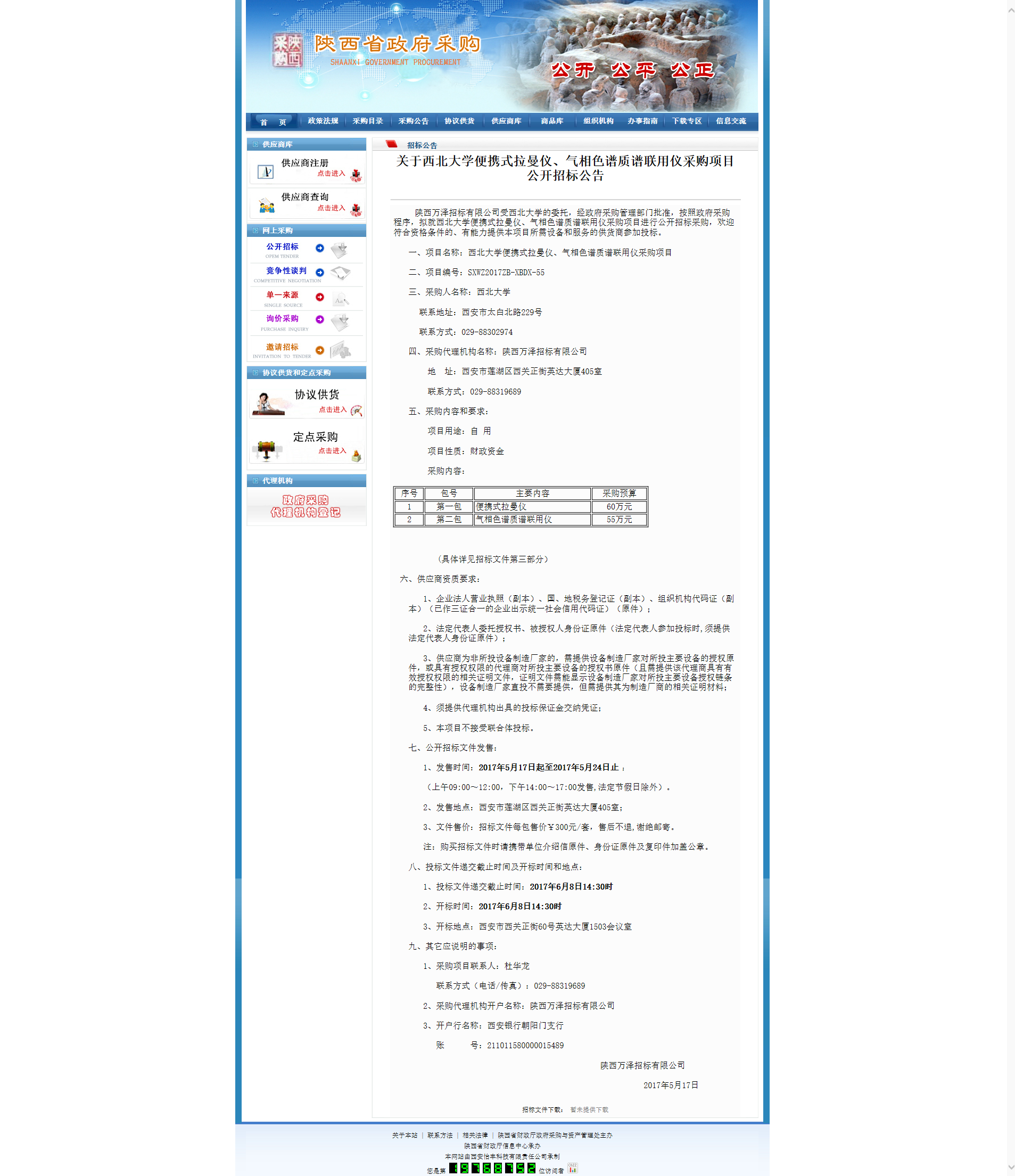 关于MILAN.COM便携式拉曼仪、气相色谱质谱联用仪采购项目公开招标公告 作者: 编辑: 时间:2017-05-17 16:50 http://www.ccgp-shaanxi.gov.cn/zbxxs.jsp?NewsID=ZB170517133435US101028111214&ClassBID=C0001