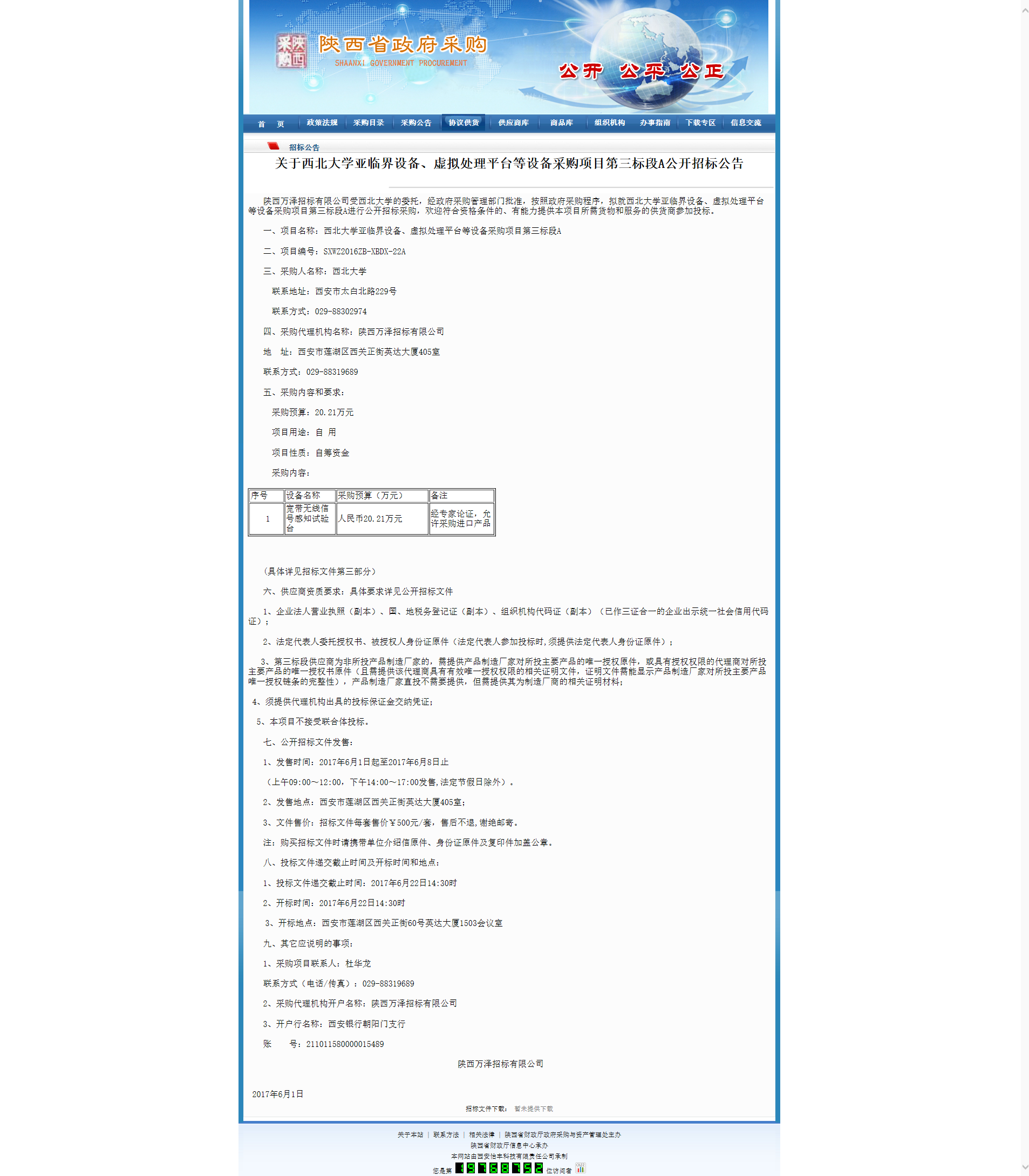 关于MILAN.COM亚临界设备、虚拟处理平台等设备采购项目第三标段A公开招标公告 作者: 编辑: 时间:2017-06-02 08:20 http://www.ccgp-shaanxi.gov.cn/zbxxs.jsp?NewsID=ZB170601090022US101028111214&ClassBID=C0001