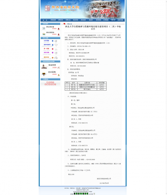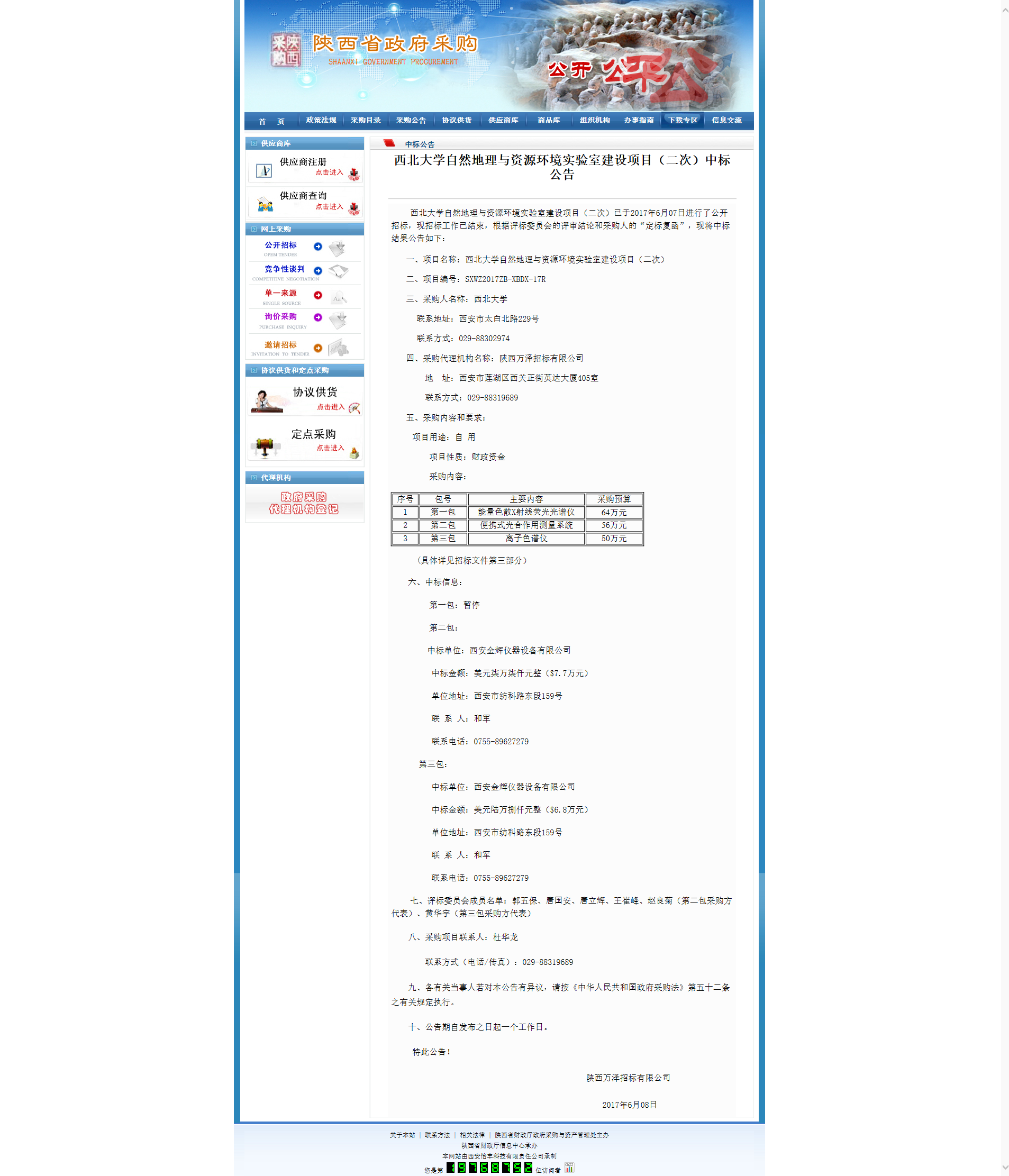 MILAN.COM自然地理与资源环境实验室建设项目(二次)中标公告 作者: 编辑: 时间:2017-06-09 08:34 http://www.ccgp-shaanxi.gov.cn/zbxxs.jsp?NewsID=ZH170608102215US101028111214&ClassBID=C0002
