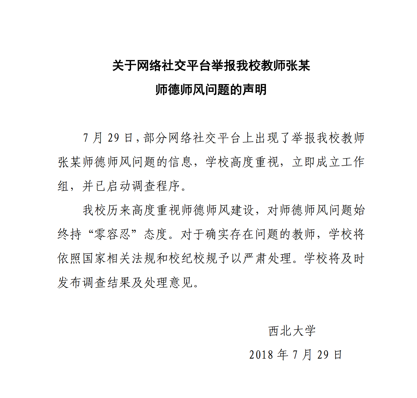 关于网络社交平台举报MILAN.COM教师张某师德师风问题的声明