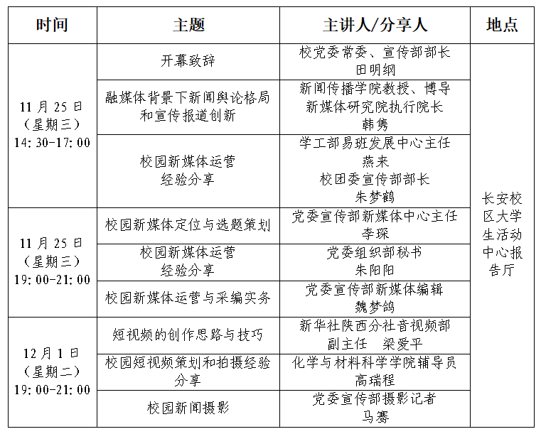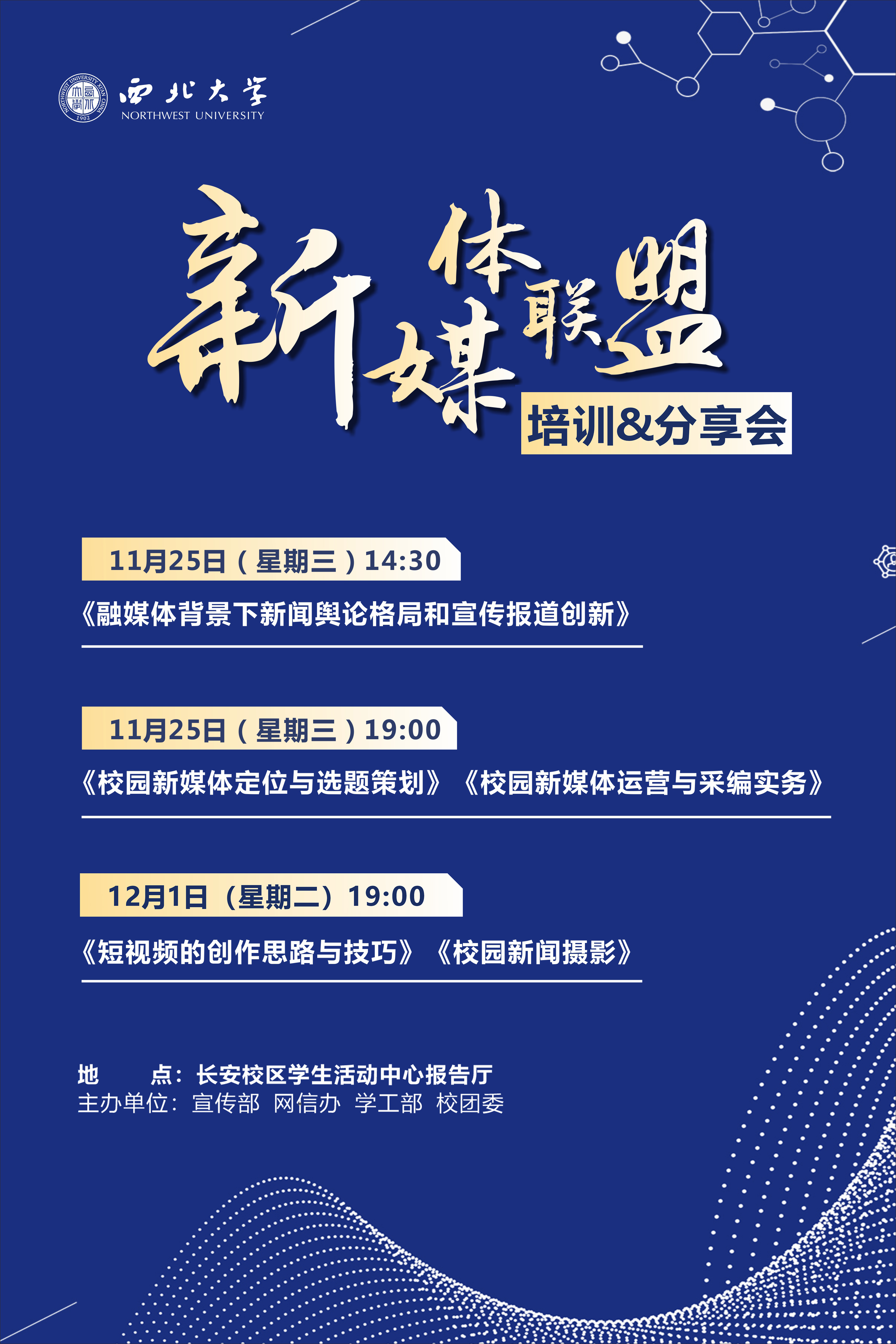 关于举办MILAN.COM新媒体联盟培训分享会的通知 作者: 编辑:李琛 时间:2020-11-19 校内各单位: 为进一步加强校内新媒体建设与管理,推进校园媒体深度融合发展,搭建有效联动、聚合传播的交流平台,MILAN.COM新媒体联盟将于近期举办培训分享会。现将有关安排通知如下: 一、参会人员: MILAN.COM新媒体联盟成员单位指导老师、学生骨干;全校宣传思想类学生社团全体成员;校内各单位师生通讯员。 二、会议安排: 请各单位组织相关师生按时参会。 宣传部 网信办 学工部 校团委 2020年11月17日