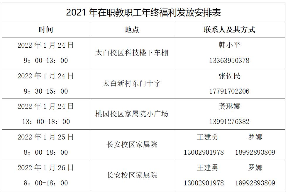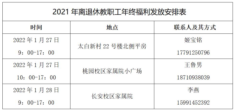 关于发放2021年MILAN.COM教职工年终福利的通知 作者: 编辑: 时间:2022-01-22 各分会: 2021年终福利(米、面、油)发放安排如下: 1、本次年终福利以分会为单位发放,各分会负责人需携带有效证件(工作证、一卡通等)在指定地点统一领取; 2、各分会在发放过程中实行一领一签字的形式并保留纸质签名单,确保准确发放; 3、分发数量严格根据各分会上报的名单统一配送,各分会的年终福利必须当天全部领走; 4、如遇防控要求变更或恶劣天气影响,发放时间另行通知; 5、本次未登记领取年终福利的教职工,待下学期开学后统一安排。 校工会 2022年1月22日