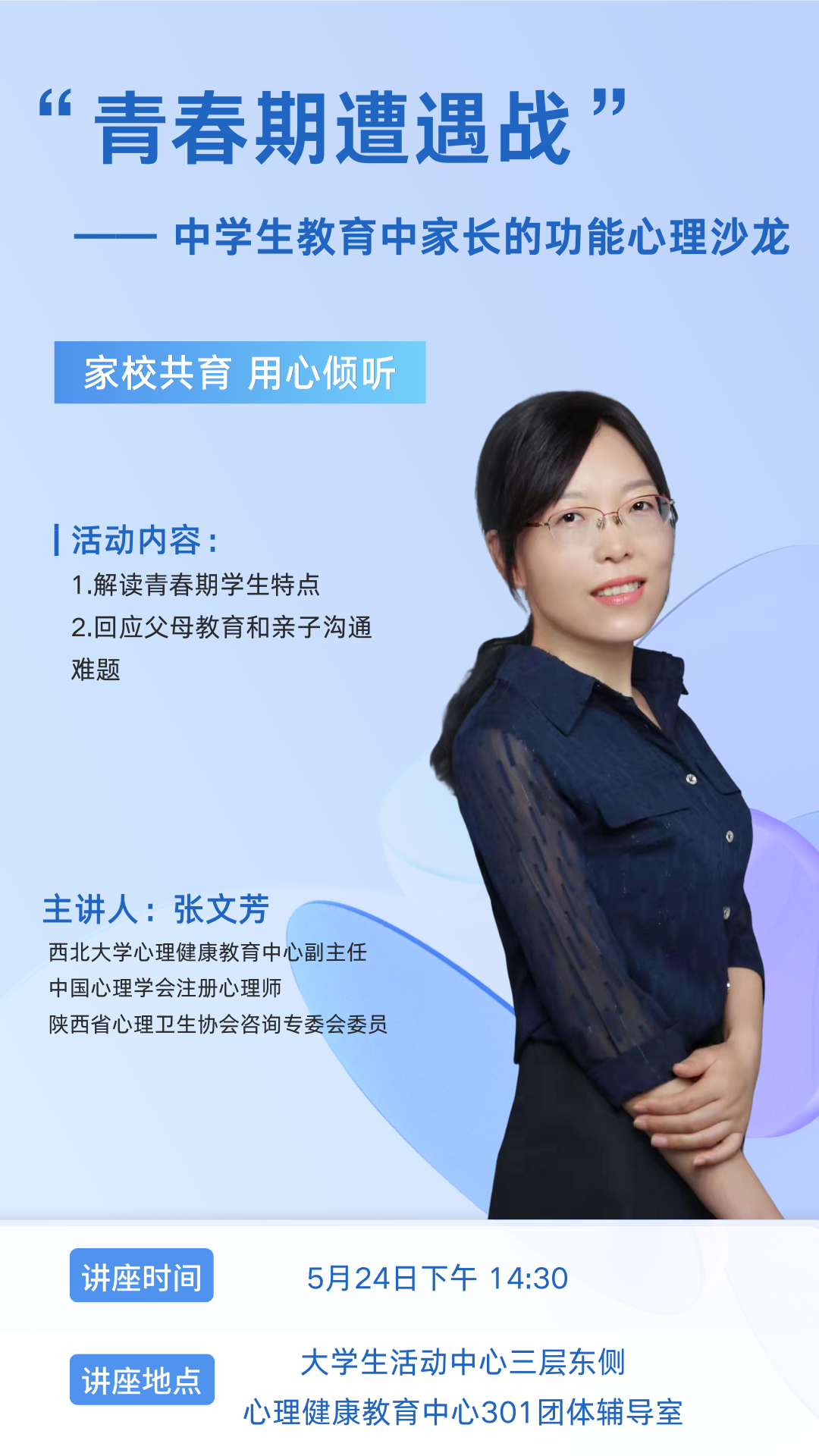 活动地点:长安校区大学生活动中心三层东侧心理健康教育中心301团体辅导室