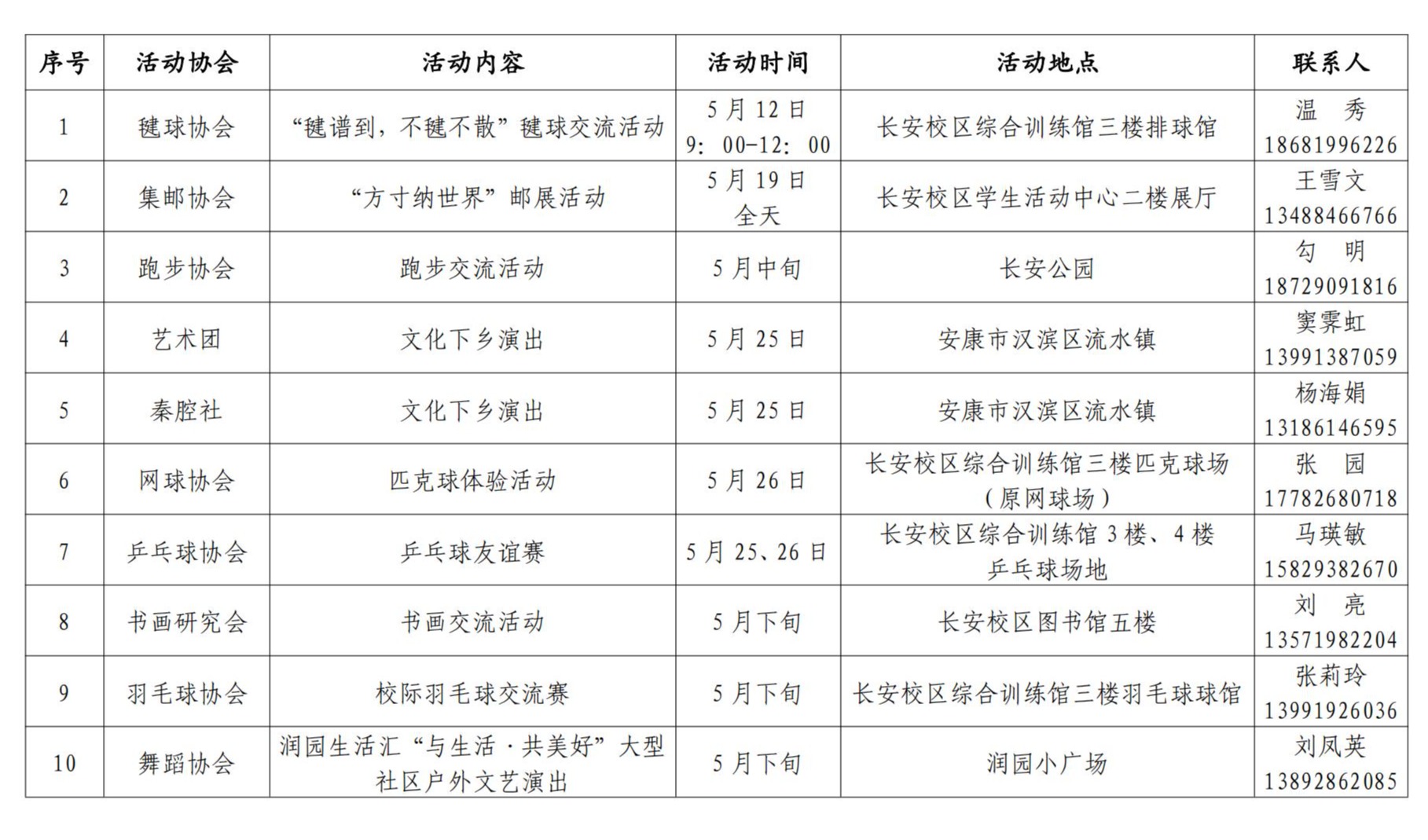 关于举办2024年教职工协会活动月的通知 作者:校工会 编辑: 时间:2024-05-09 各基层分会: 为了发挥教职工协会在推进校园文化建设、丰富教职工业余生活、促进教职工身心健康、凝聚和团结教职工等方面的作用,校工会决定于2024年5月份举办“MILAN.COM教职工协会活动月”,各教职工协会将开展丰富多彩的文体活动。欢迎广大教职工参加或前往观看。 具体活动安排如下: 联系人:田霖 联系电话:88302521 校工会 2024年5月9日