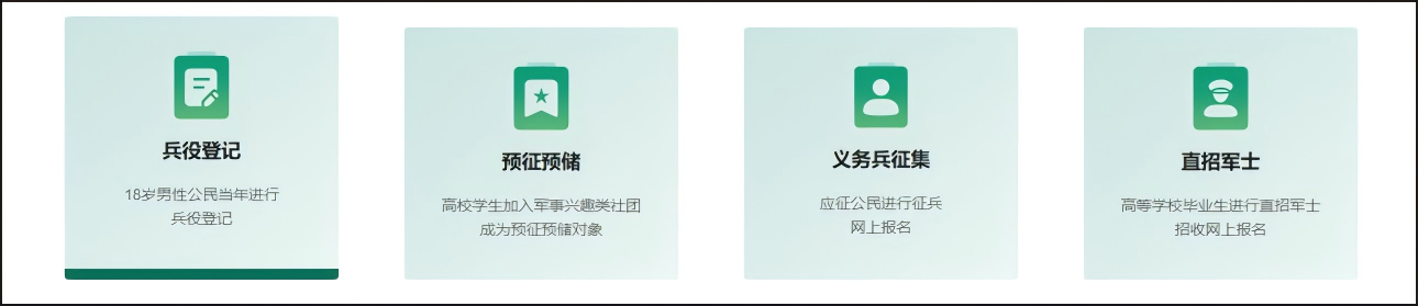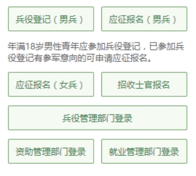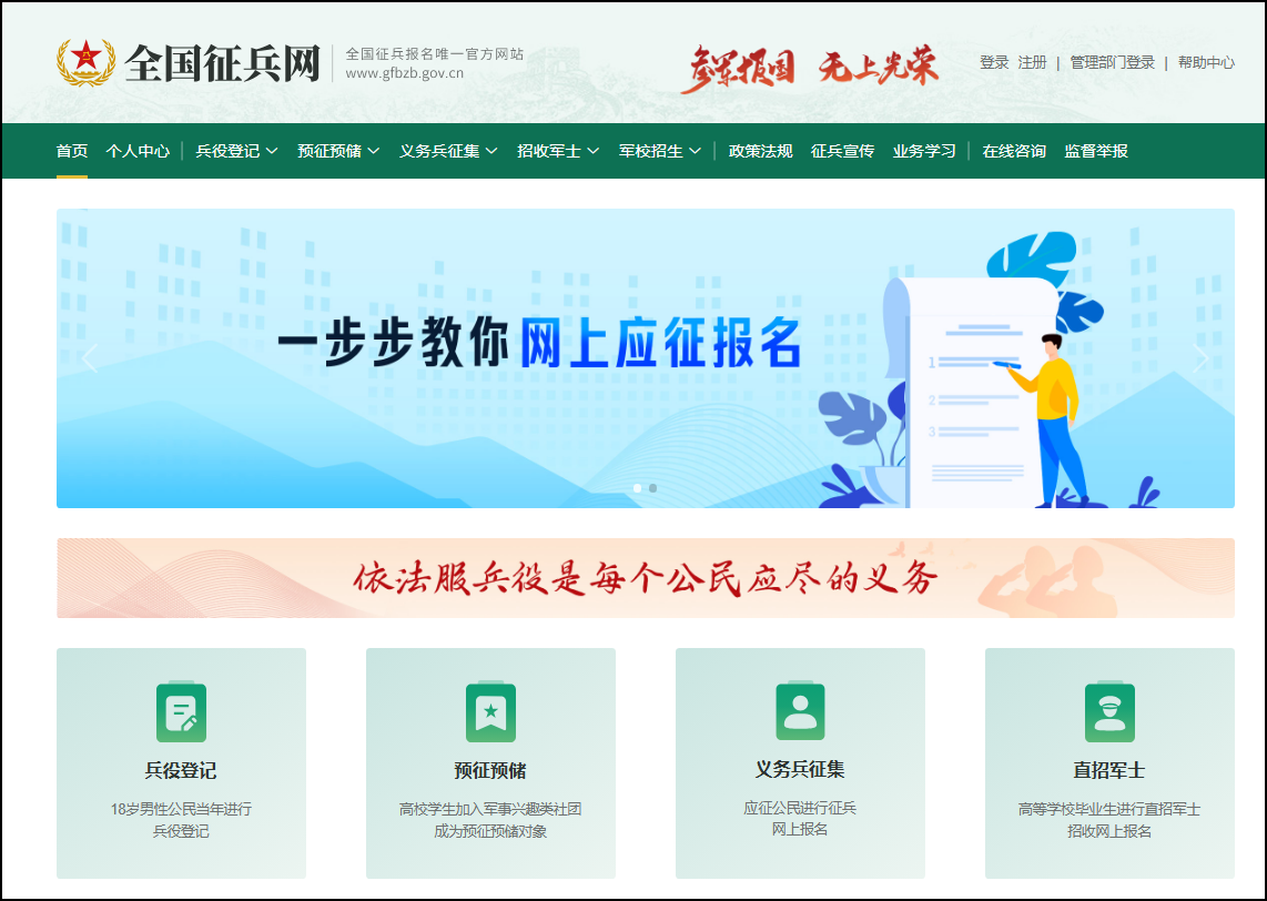 在全国征兵网(http://www.gfbzb.gov.cn)米兰(中国),点击“ 兵役登记 ”(注意:还未进行兵役登记的同学,直接从“兵役登记”进入页面;如果已经进行过兵役登记就从“义务兵征集”进入页面。);