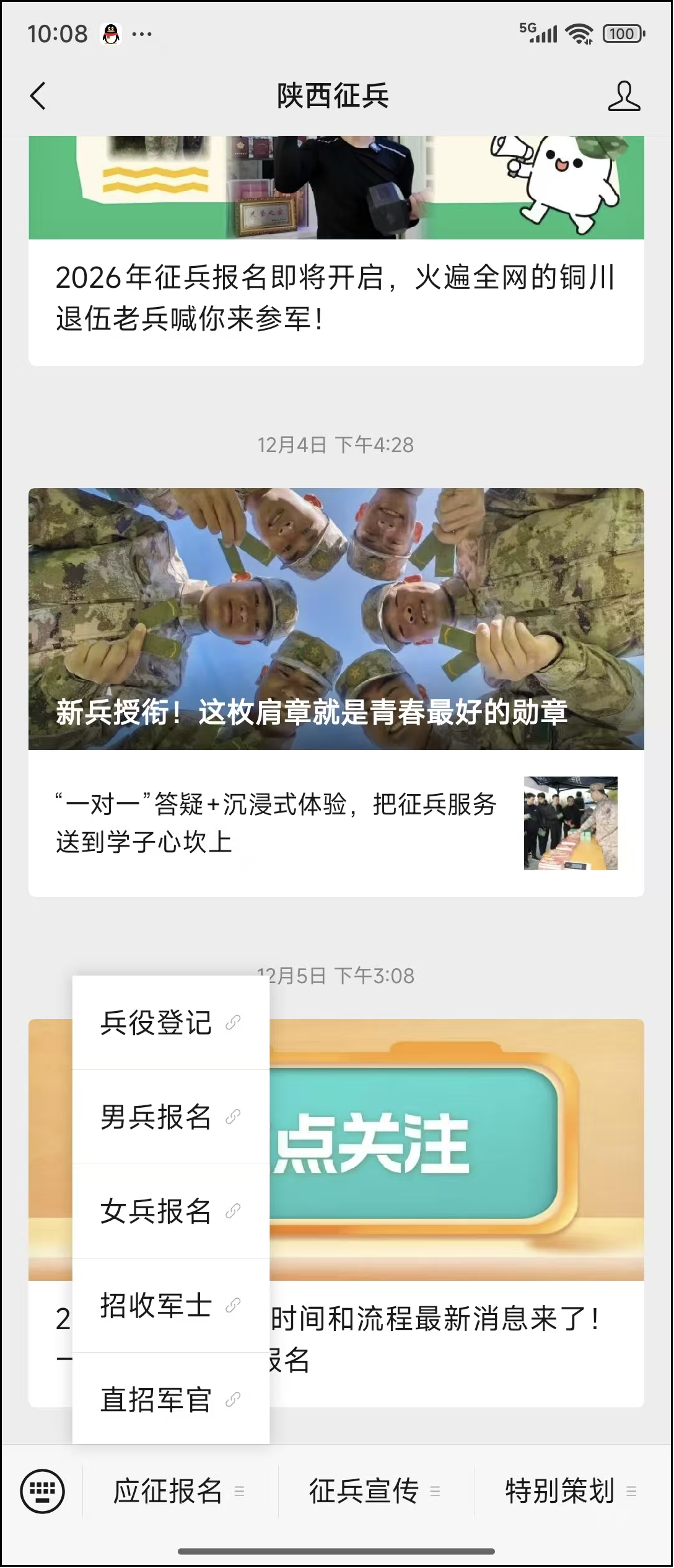 方式二:关注“陕西征兵”公众号,点击菜单栏“应征报名”,选择“男兵报名”或“女兵报名”直通报名页面。