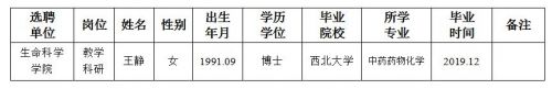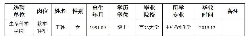 经用人单位及教学督导考核、学校研究,拟同意选聘下列人员来校工作,其聘任关系为A类人事代理。本着公平、公正、公开的原则,现将拟选聘人员基本情况公示如下: