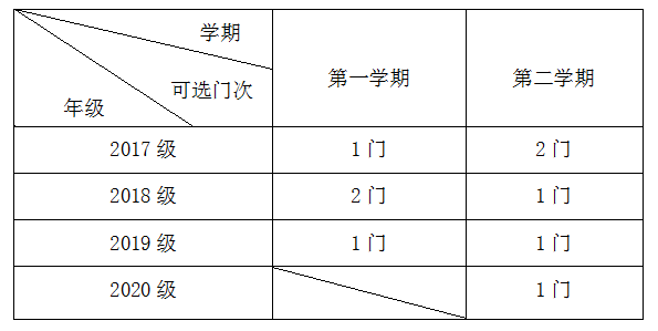 1.根据学校教学计划安排和教学资源设置情况,在选课门次上,一年级新生第一学期暂不修读通识教育选修课程,第二学期每人限选1门、二年级学生每人每学期限选1门、三年级和四年级学生可在上下两学期交错选课1-2门。具体可选课门次如下表所示: