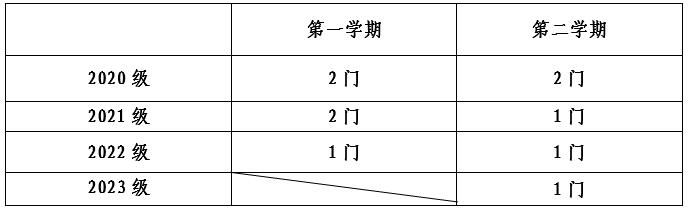 1.根据学校教学计划安排和教学资源设置情况,在选课门次上,一年级新生第一学期暂不修读通识教育选修课程,第二学期每人限选1门、二年级学生每人每学期限选1门、三年级和四年级学生可在上下两学期交错选课1-2门。具体可选课门次如下表所示:
