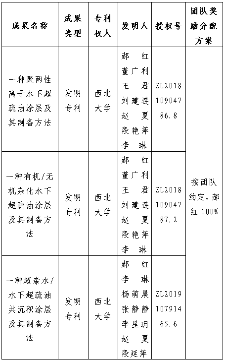 1.该发明公开了一种聚两性离子水下超疏油涂层及其制备方法。该发明克服了传统涂层易剥落、耐水性差等缺点,在自清洁、石油运输、油水分离等领域具有良好的应用前景。