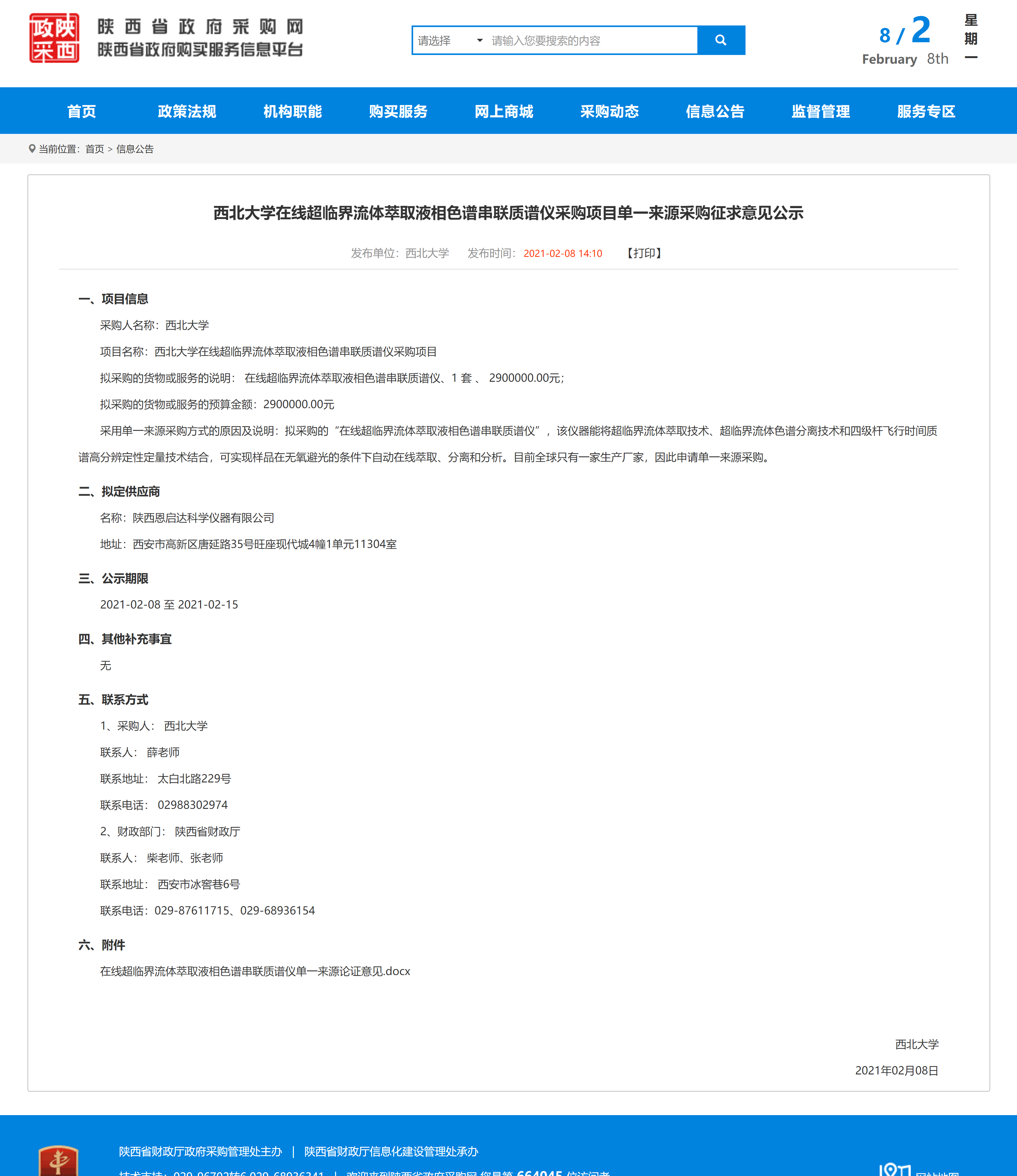 MILAN.COM在线超临界流体萃取液相色谱串联质谱仪采购项目单一来源采购征求意见公示